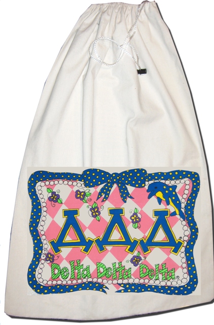 The matching Delta Delta Delta laundry bag (Item BB-GREEK Delta Delta Delta Laundry Bag) is shown in the image below. Order a laundry bag to go along with the pillowcase for a really special gift.